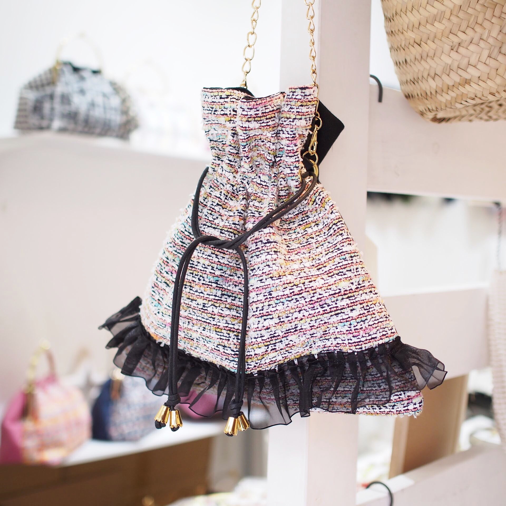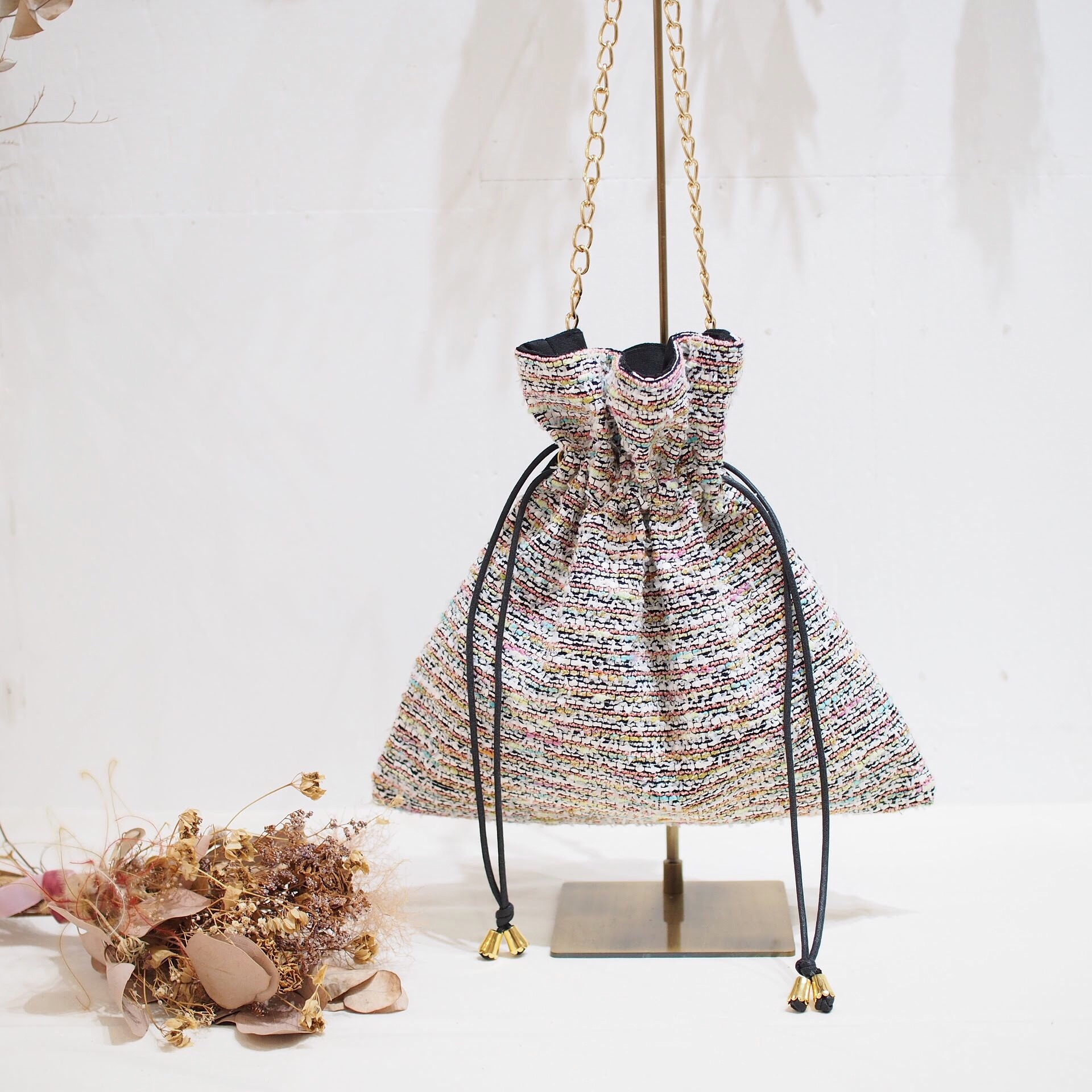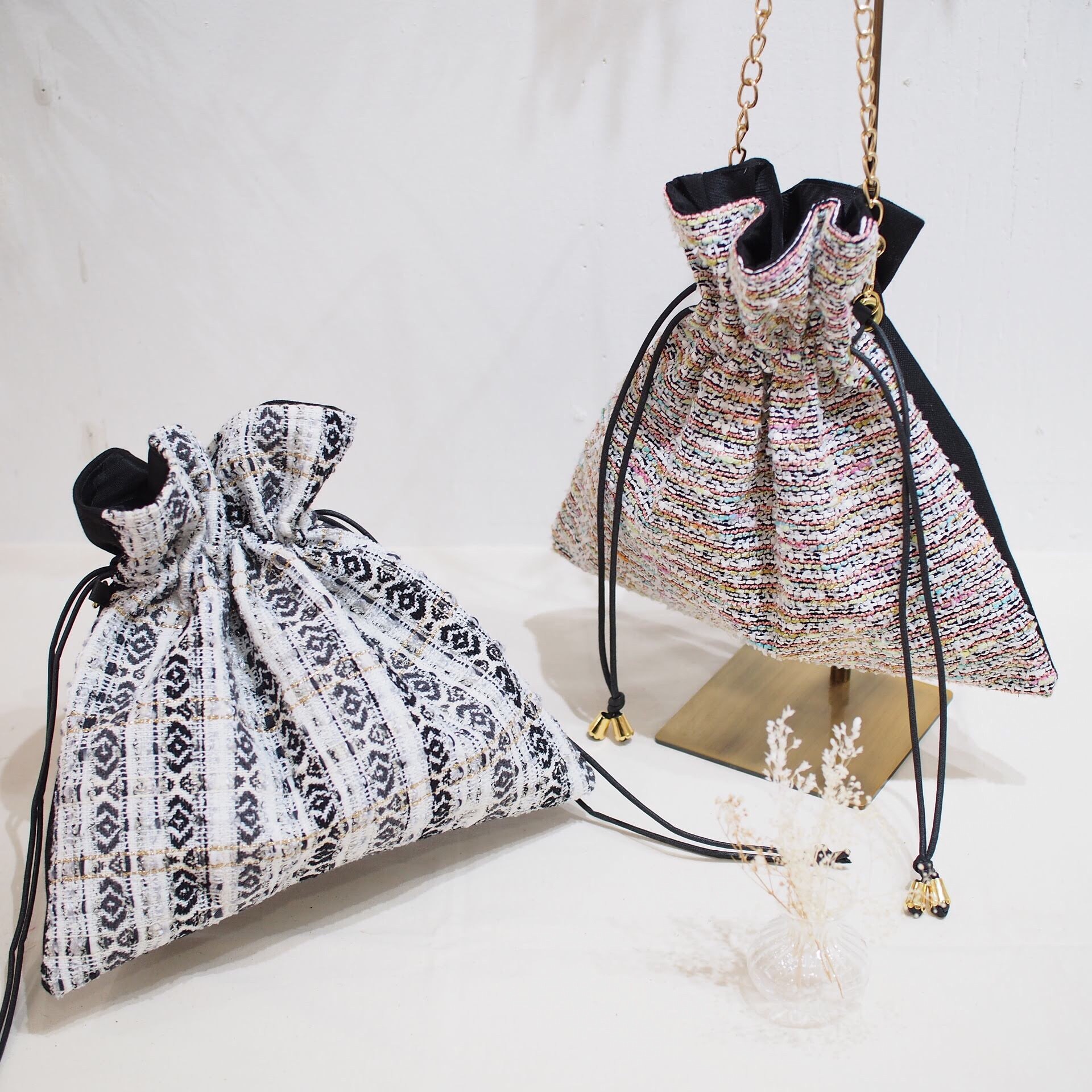 秋冬の巾着からデザインを一新してツイードの巾着バッグ制作しました。