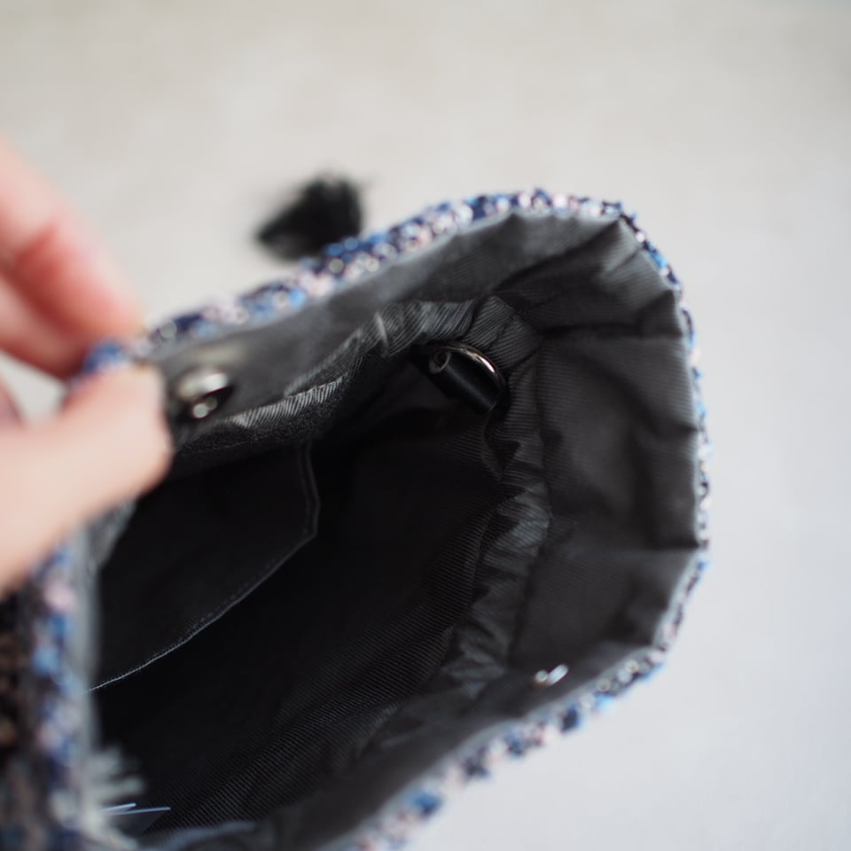 内側、両サイドにDカンを付けているので、別売りのチェーンなどを付けて斜めがけすることも可能です。