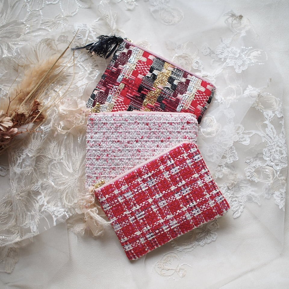 とびきり可愛いツイードは、たまにポーチのみしか作れないハギレも仕入れます。