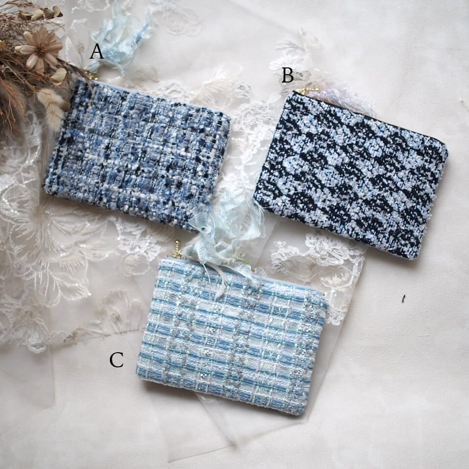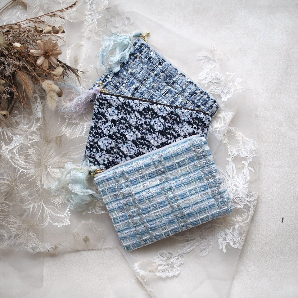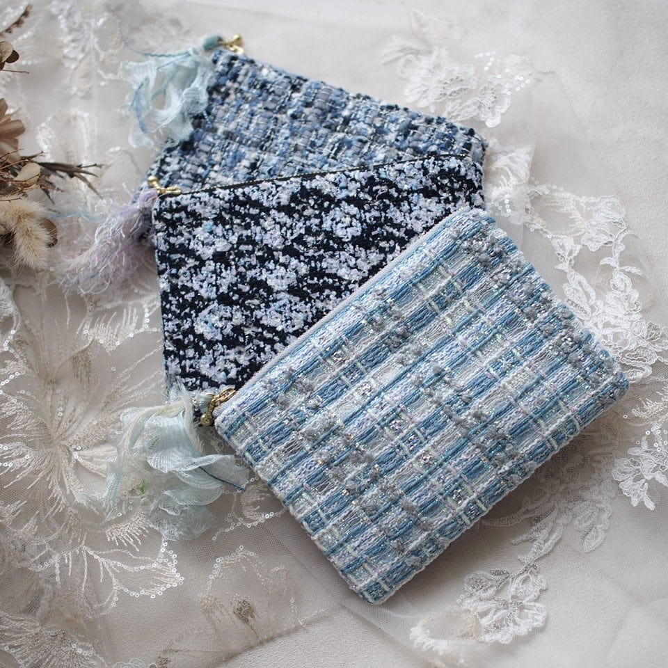 とびきり可愛いツイードは、たまにポーチのみしか作れないハギレも仕入れます。