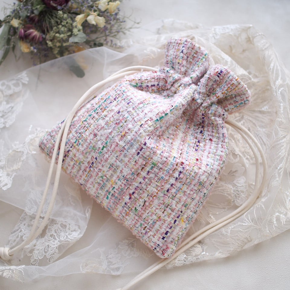 JAPAN尾州ツイードを使ったminiトートBAG。淡いピンクにシルバーの糸がふんだんに入ったツイード。織りが荒いツイードってこのラフな織りが高級感を演出してくれます。