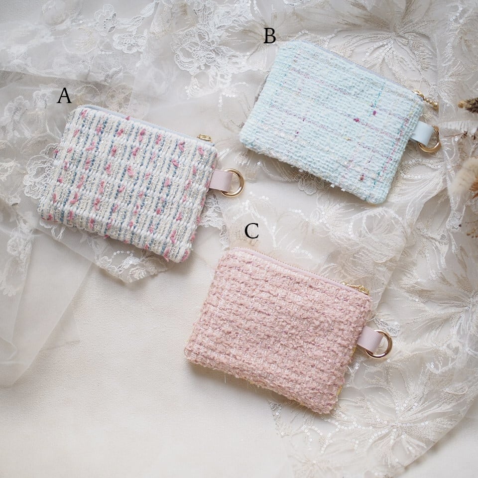 とびきり可愛いツイードは、たまにポーチのみしか作れないハギレも仕入れます。