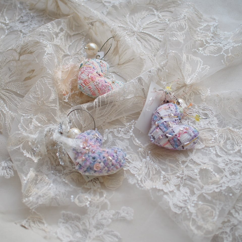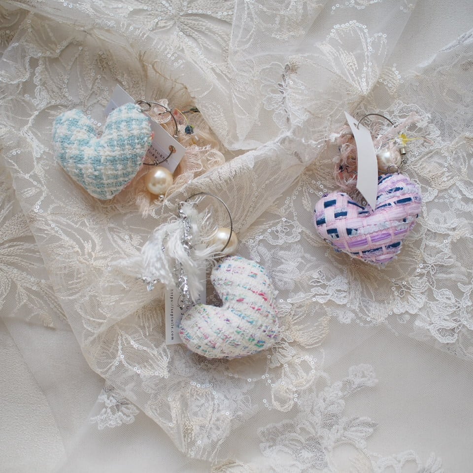 フロントにさまざまなビーズをチクチク縫い付けたバッグチャーム。