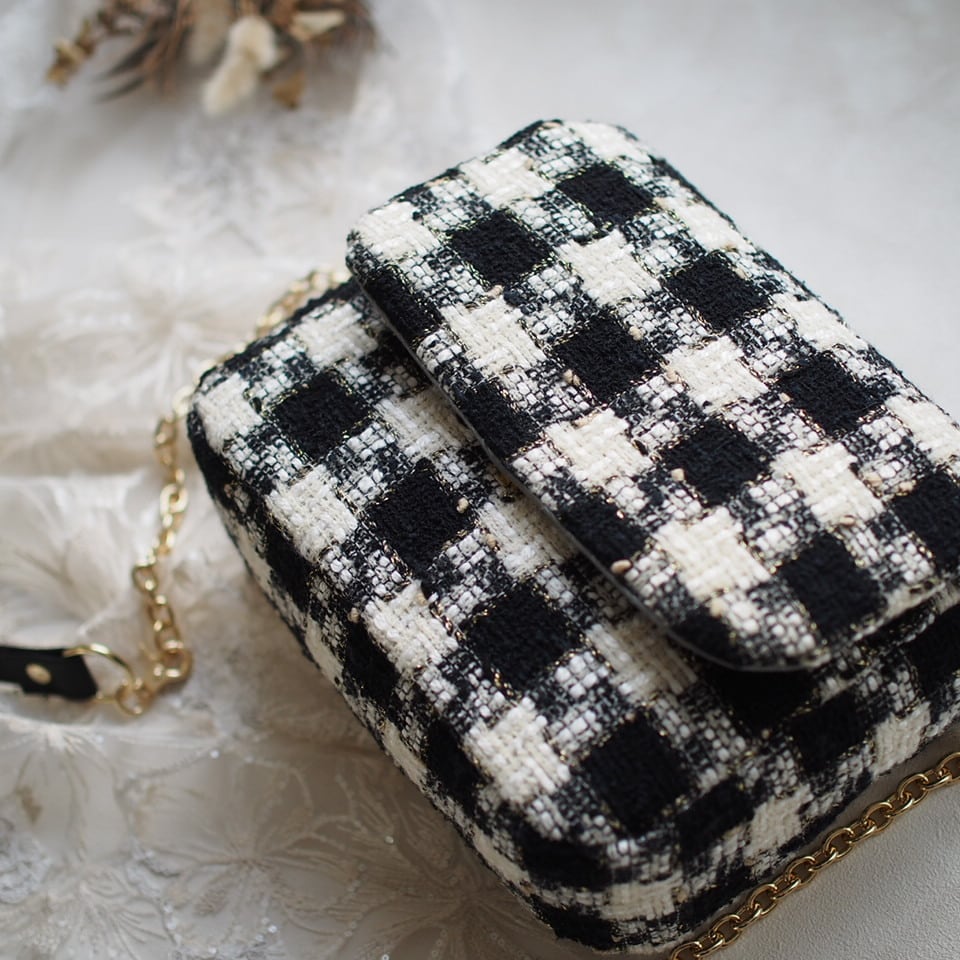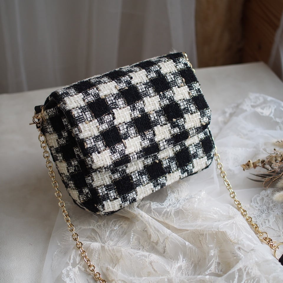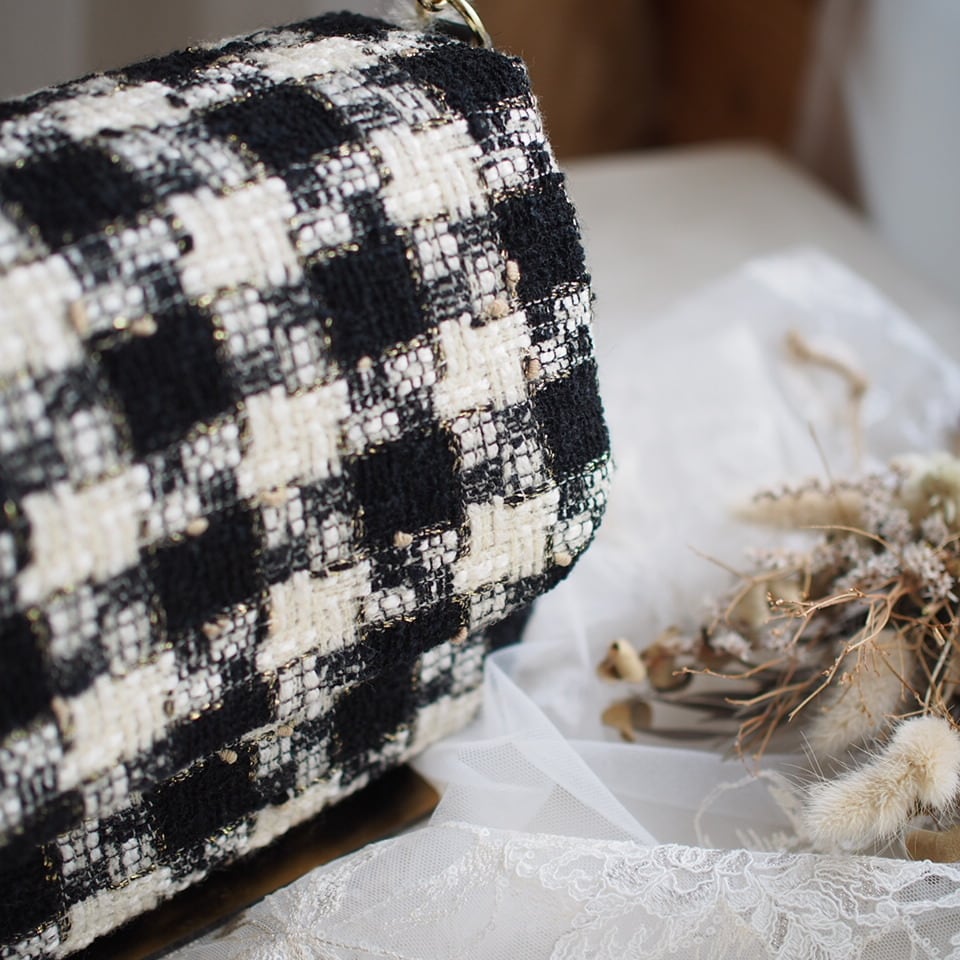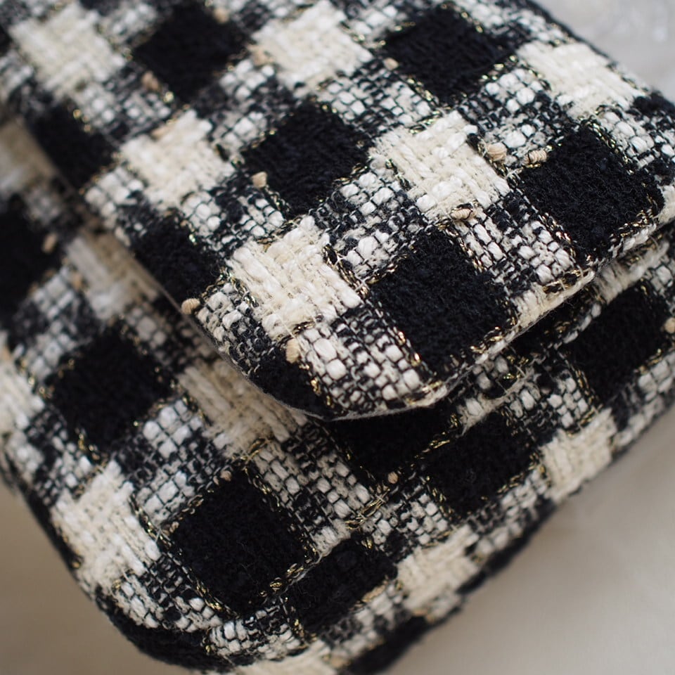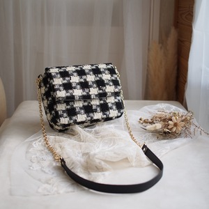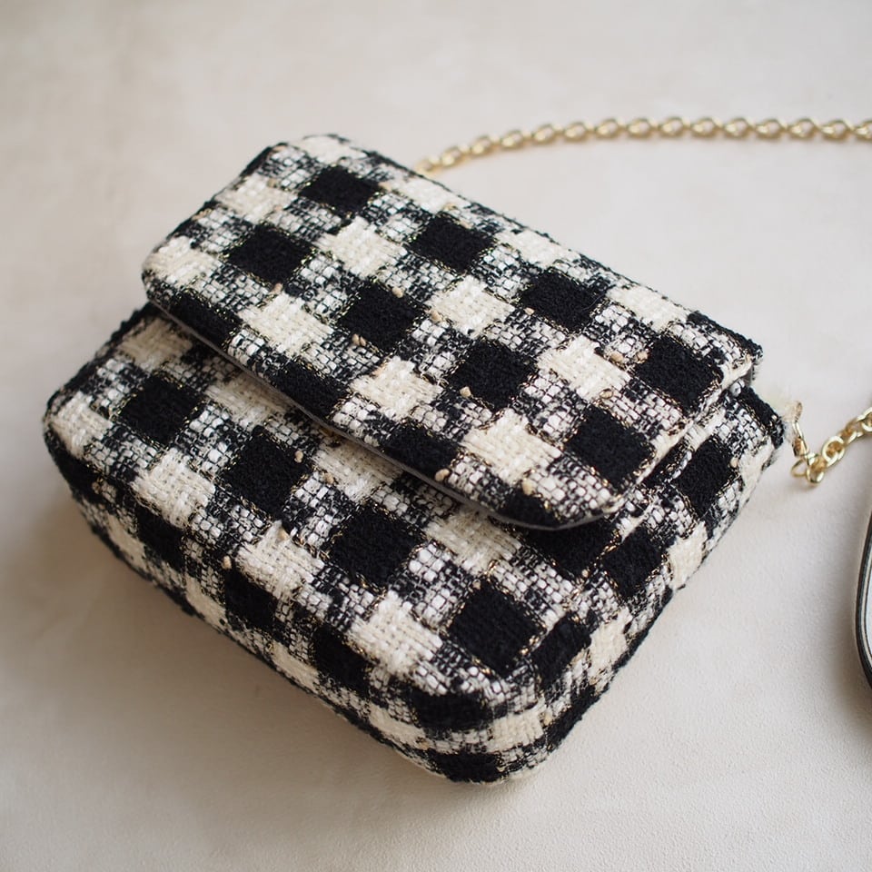 尾州のmiros社の90年代から2000年代に織られたクラシックなツイードを使った上品なショルダーバッグ。チェーンを織り込んだようなとっても美しいツイードです。