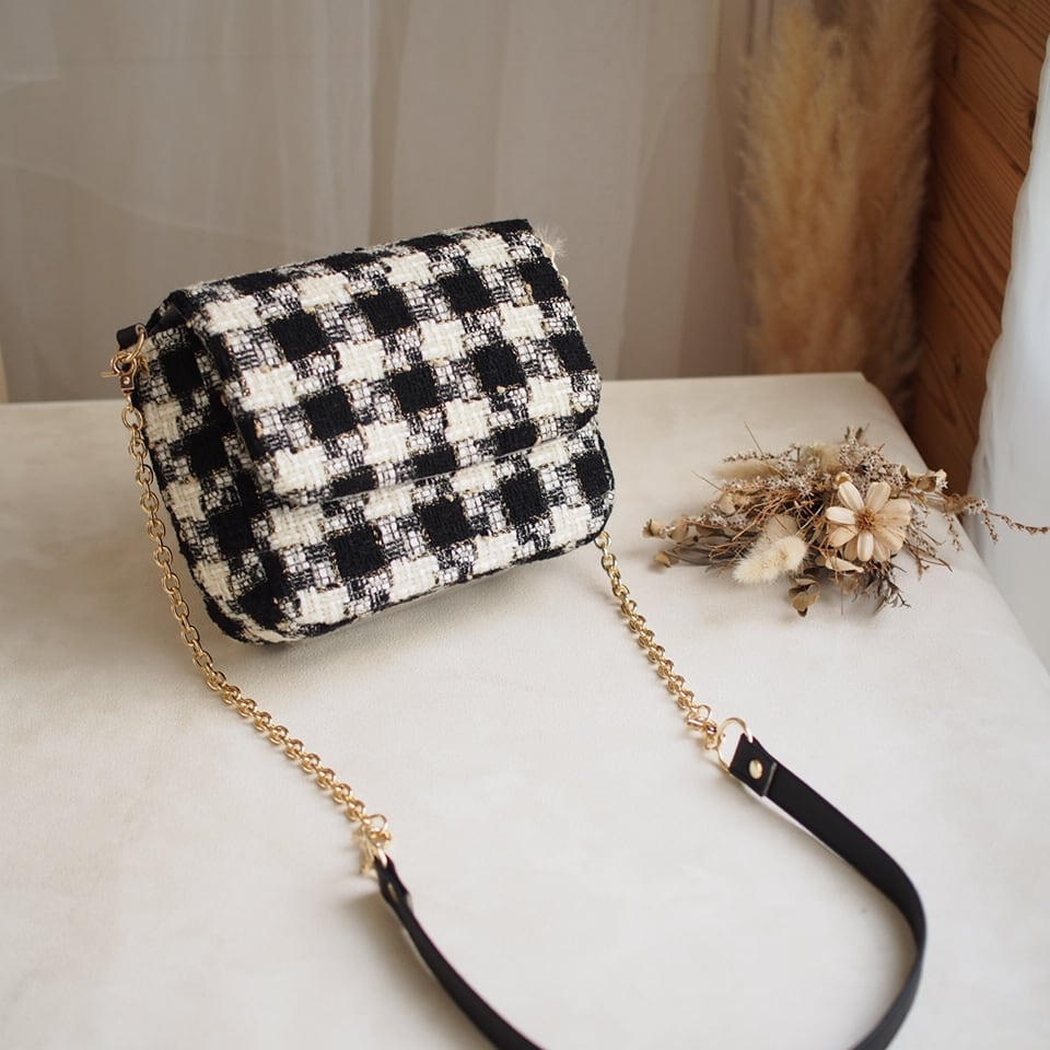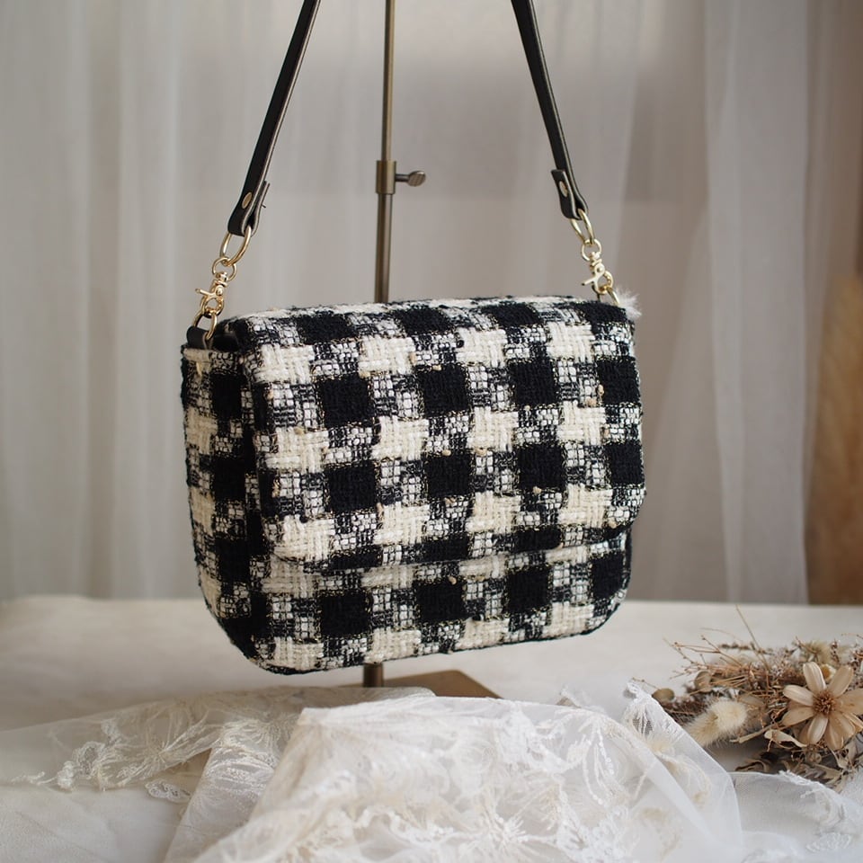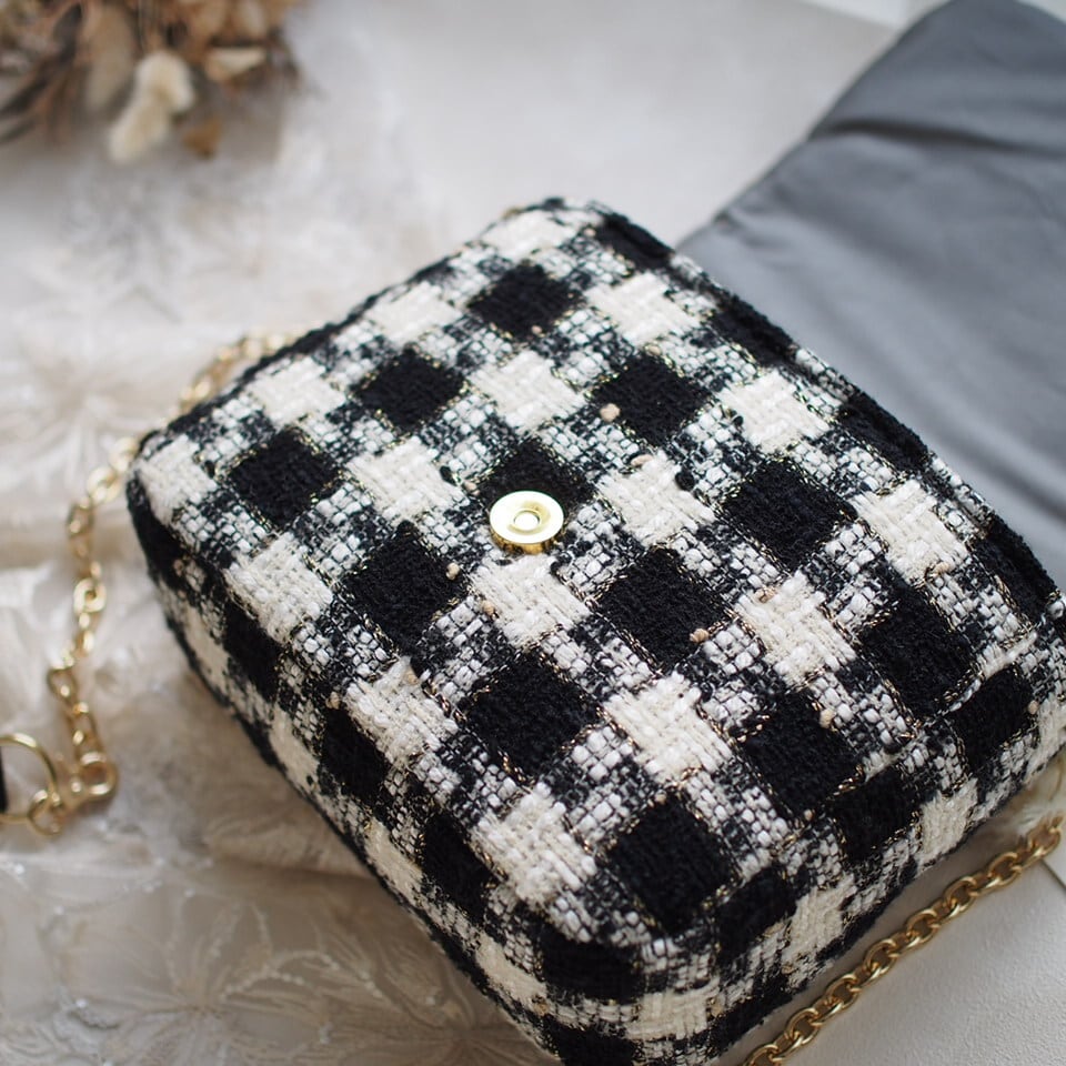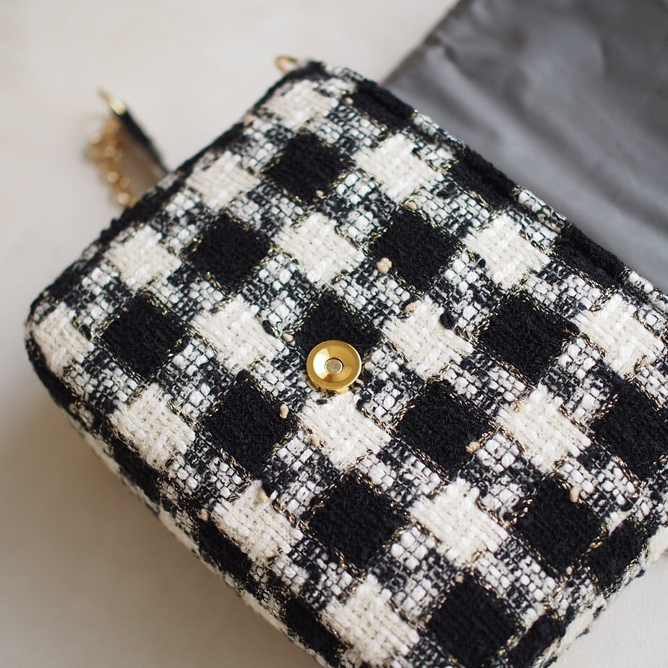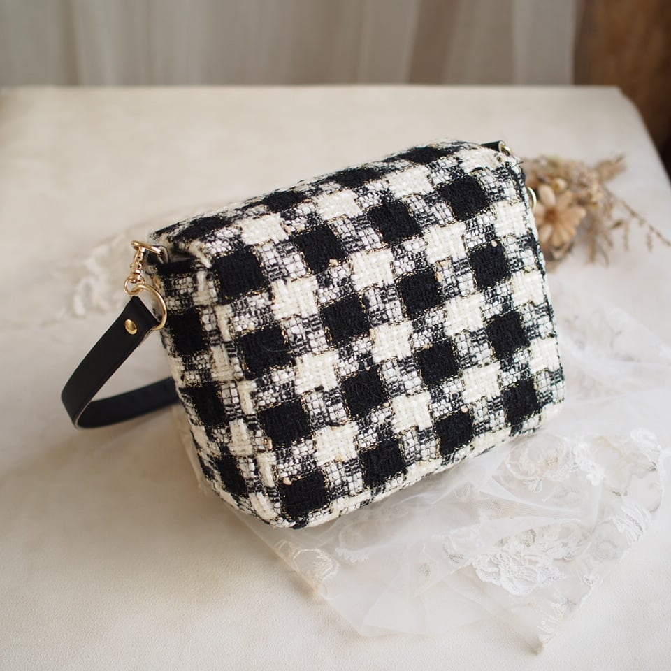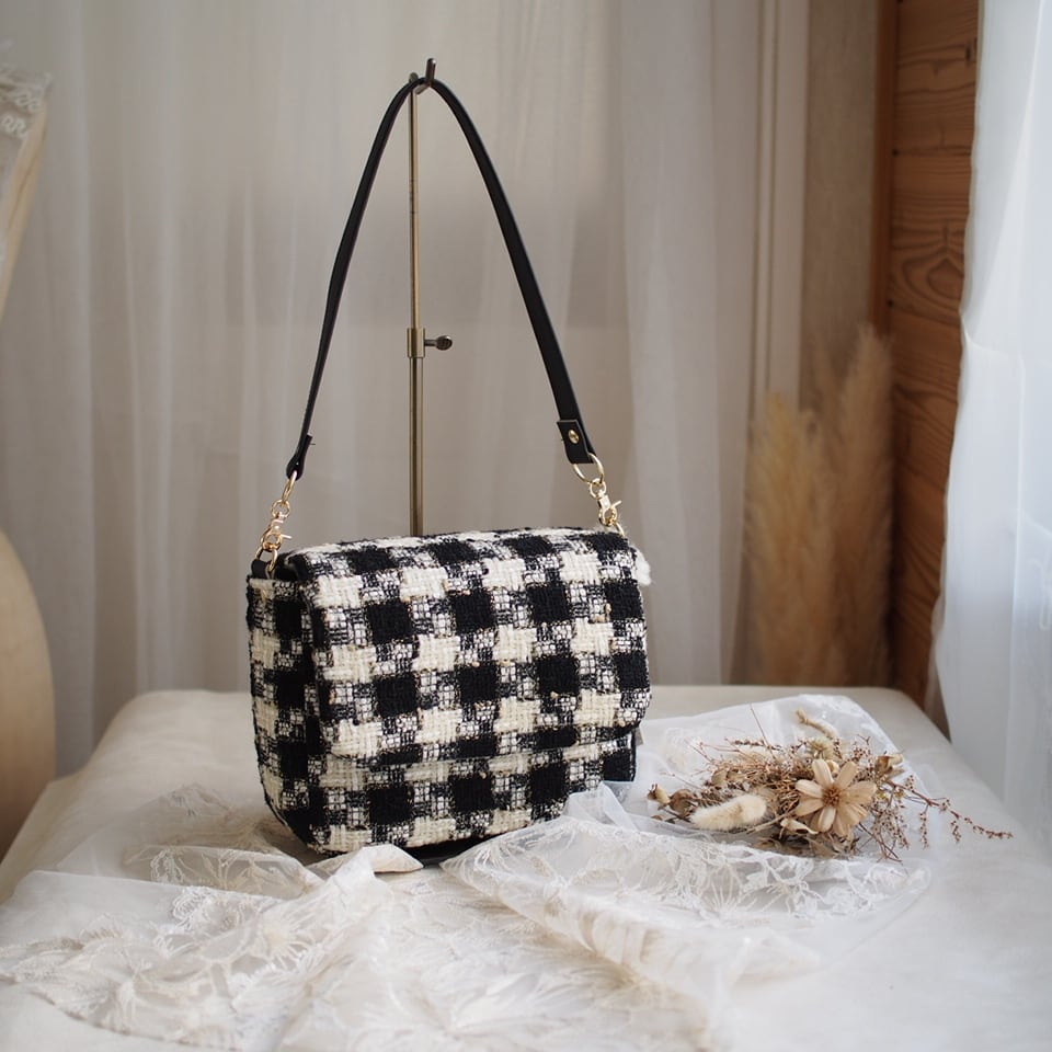尾州のmiros社の90年代から2000年代に織られたクラシックなツイードを使った上品なショルダーバッグ。チェーンを織り込んだようなとっても美しいツイードです。