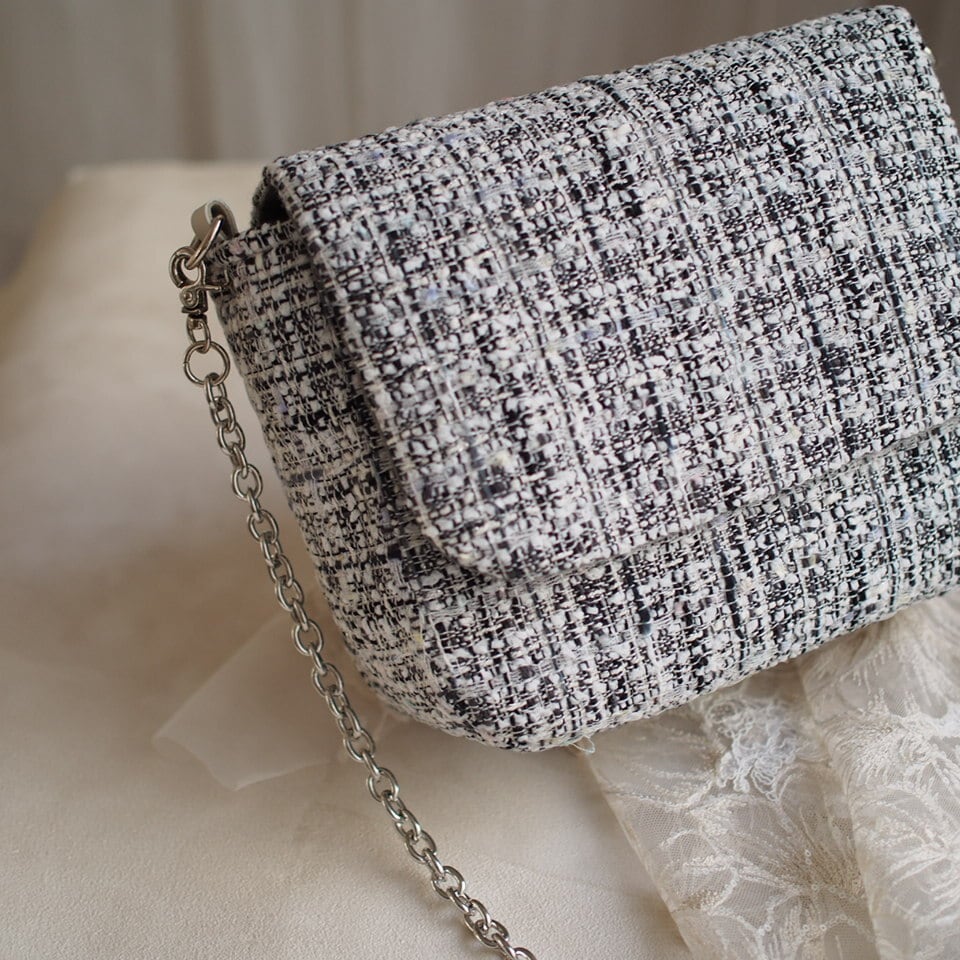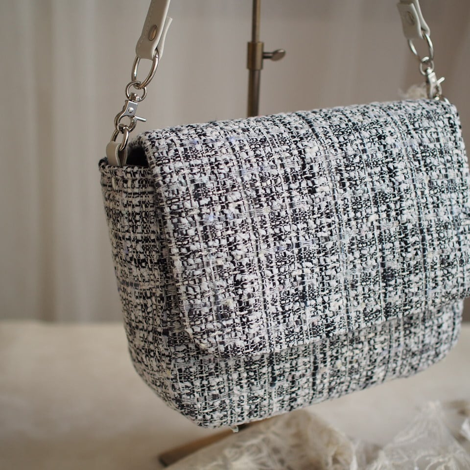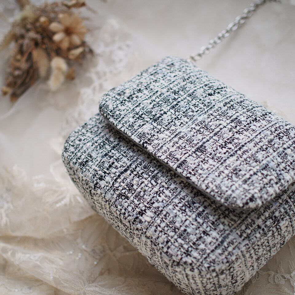 尾州ツイードを使った上品なショルダーバッグ。細かな糸で織られた繊細で、パステルの糸がさりげなく可愛いツイードです。