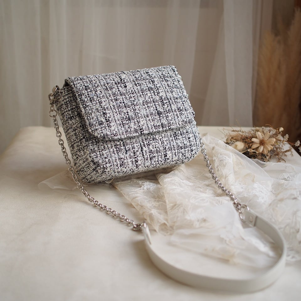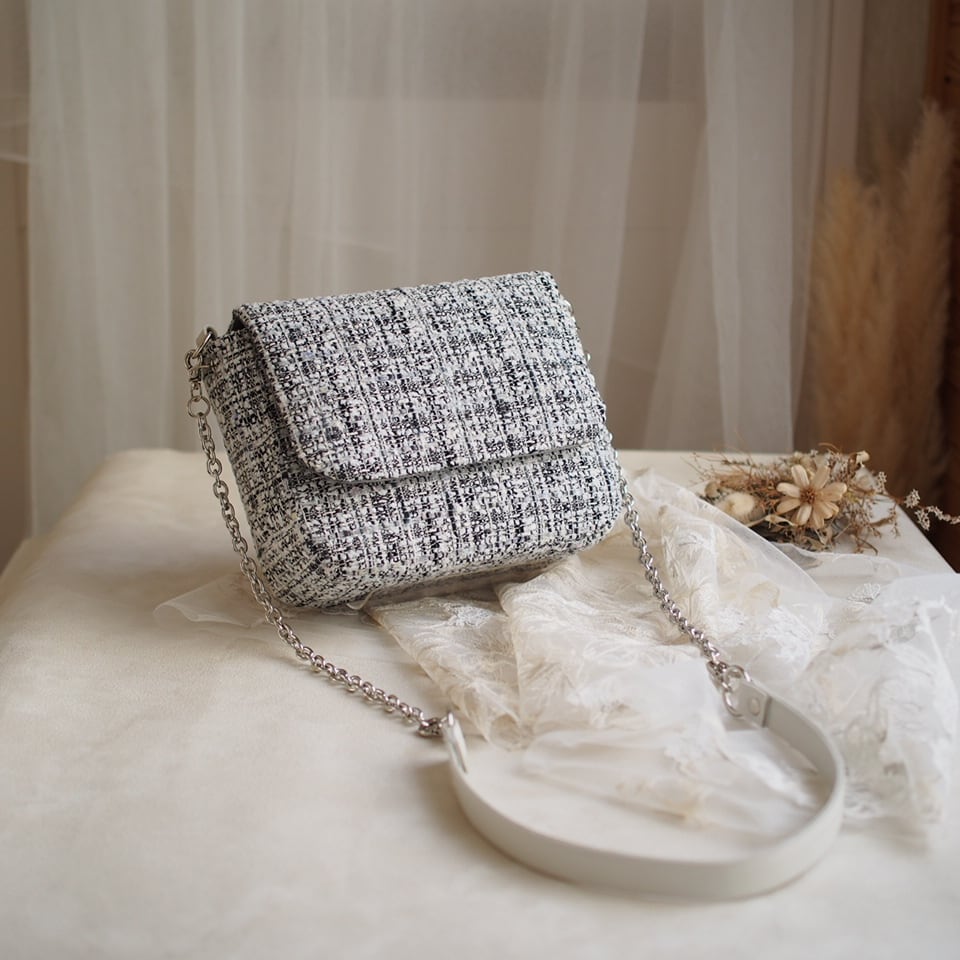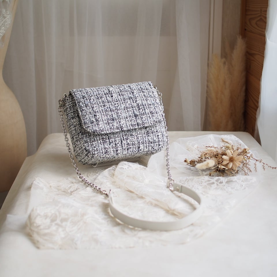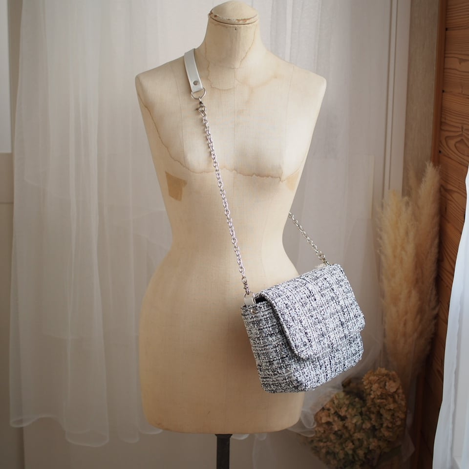 尾州ツイードを使った上品なショルダーバッグ。細かな糸で織られた繊細で、パステルの糸がさりげなく可愛いツイードです。