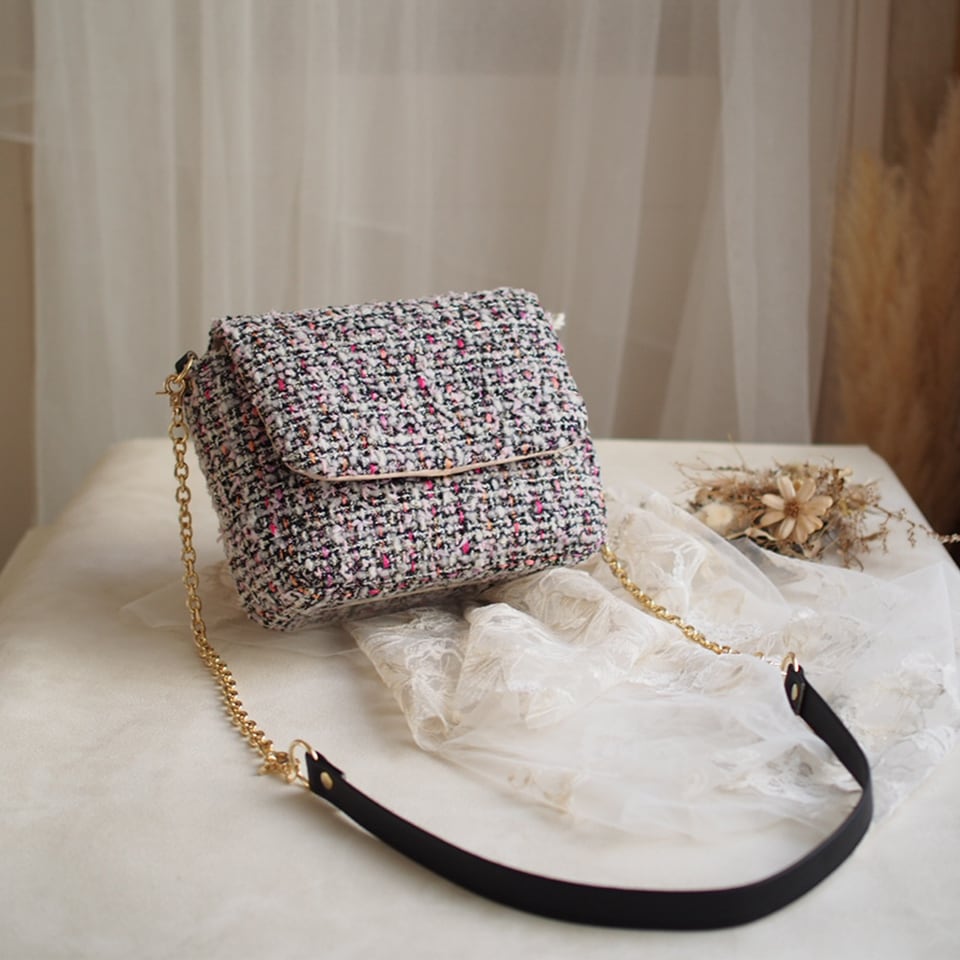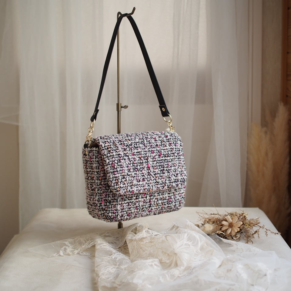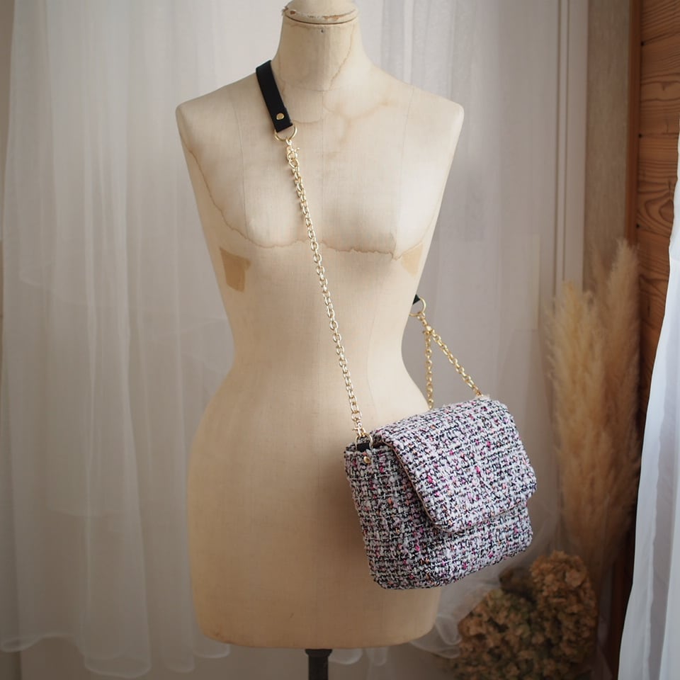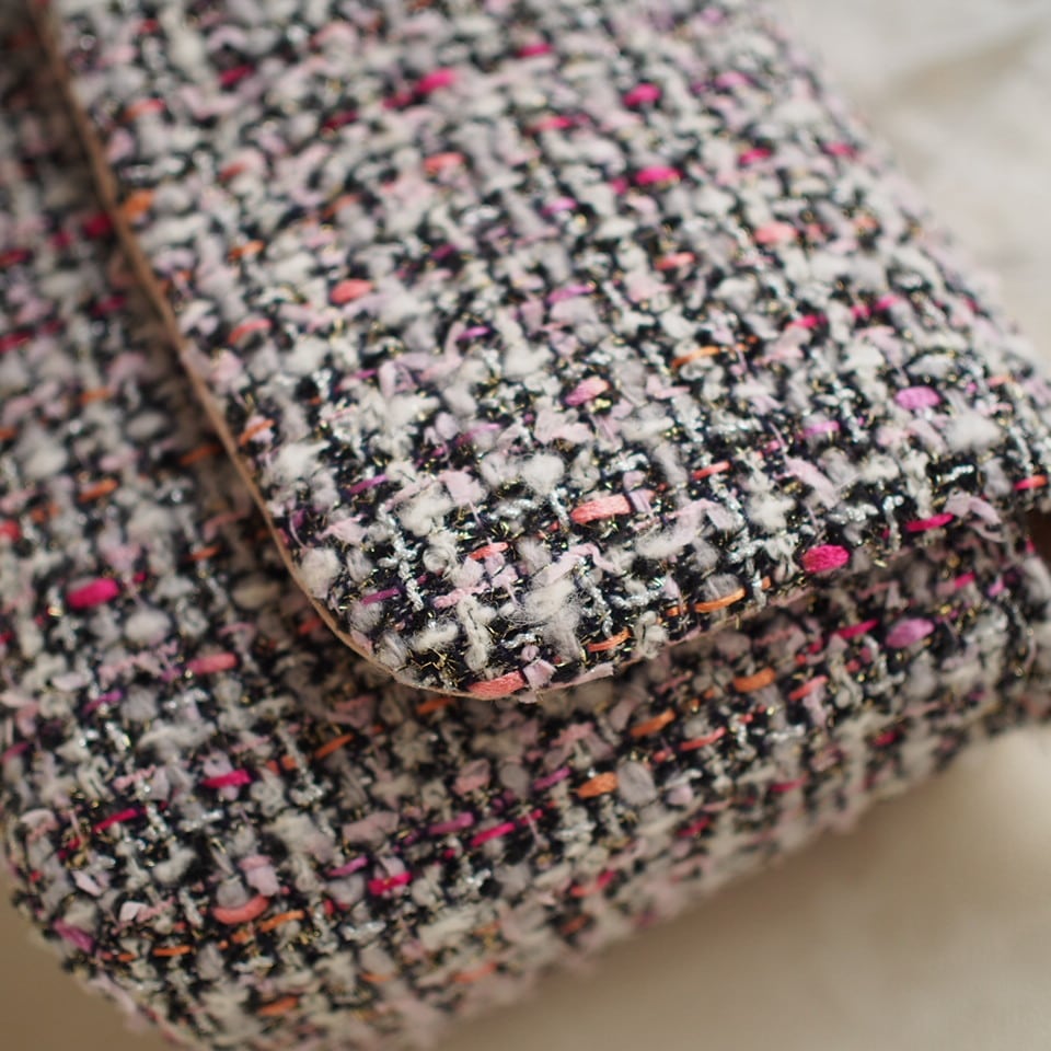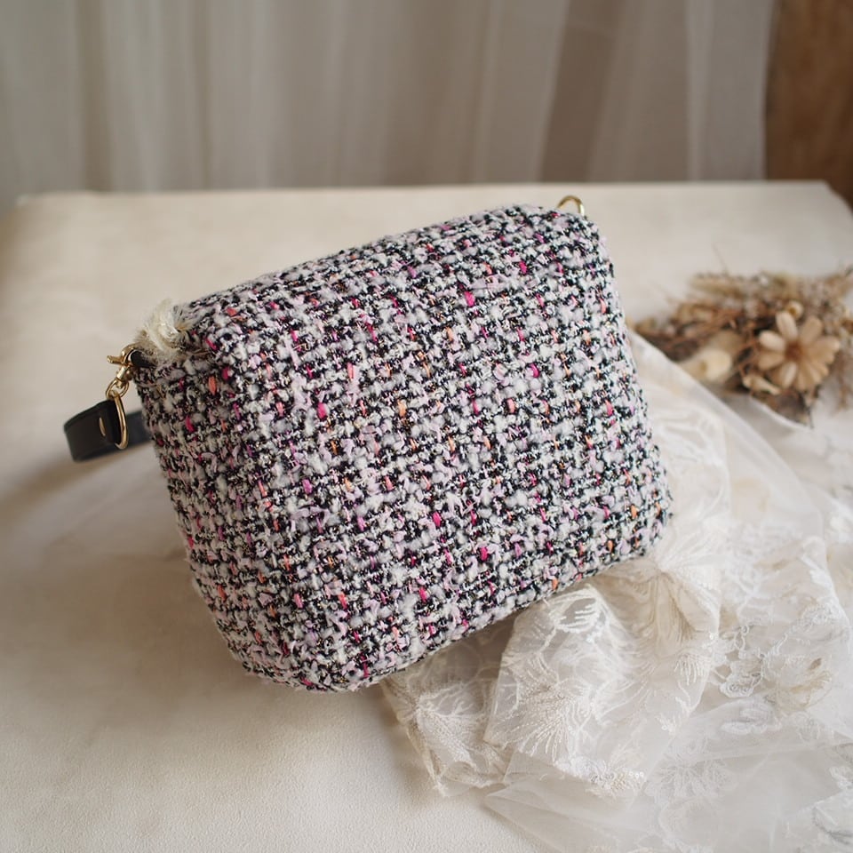 尾州のmirosツイードを使った上品なショルダーバッグ。ブラック×パープルピンクが上品さと可愛さを併せ持つスイートです。細かなシルバーの糸が遠目から見た時も、とても美しいです。
