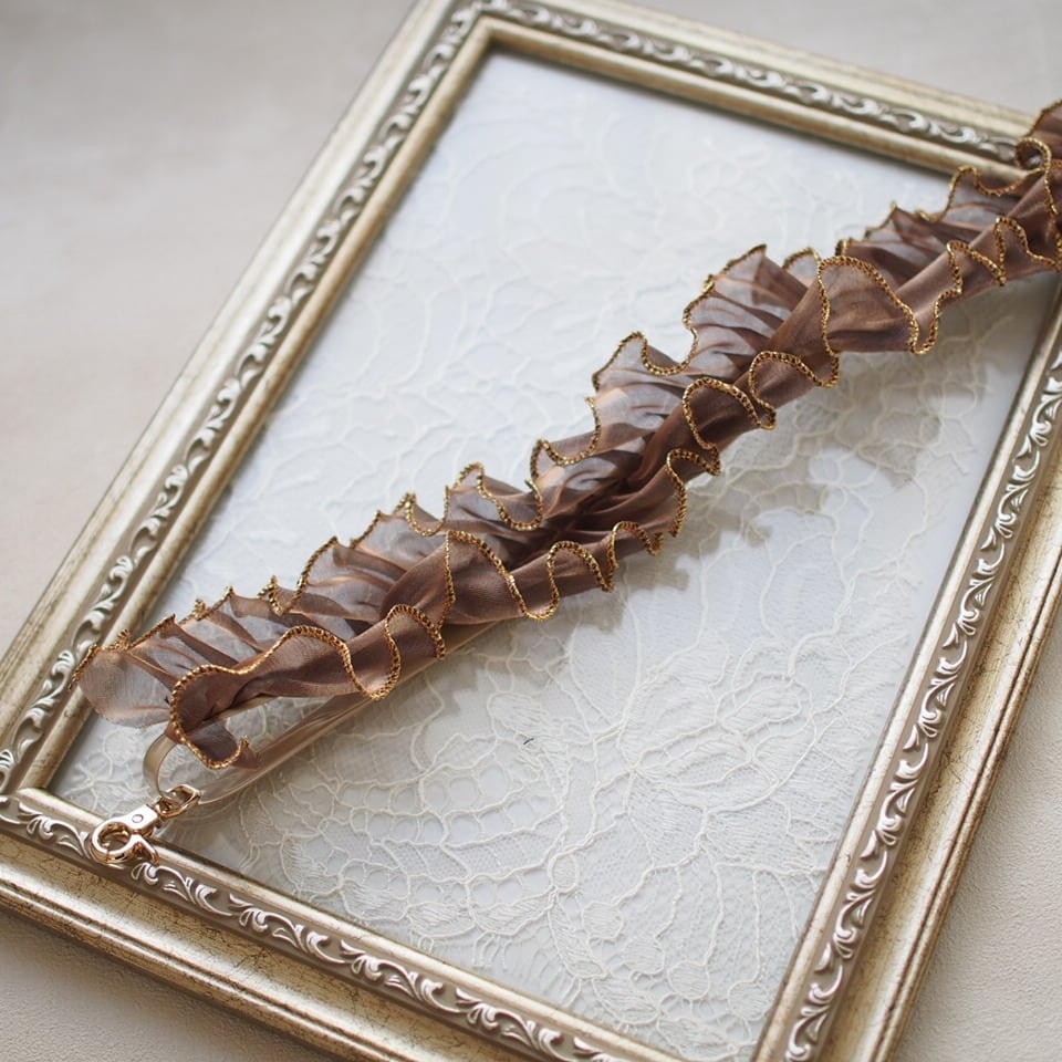 光沢感のあるマロンブラウンカラーのフリルをストラップに仕上げました。