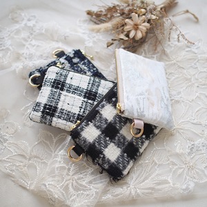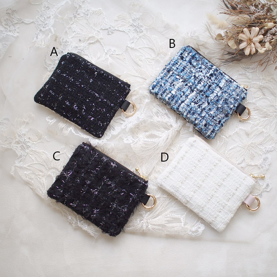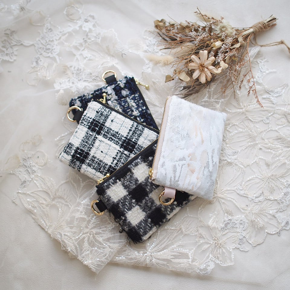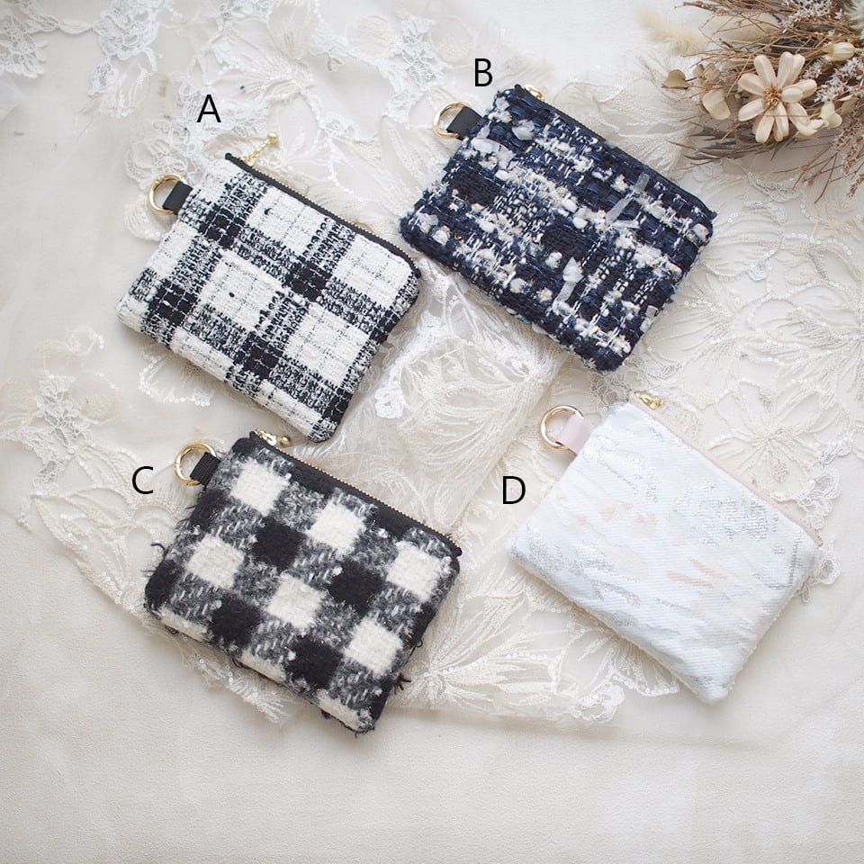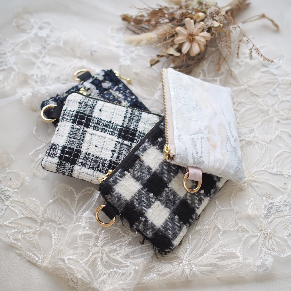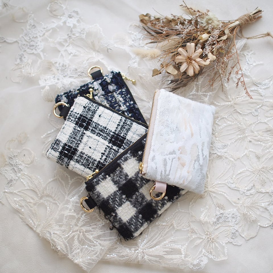 とびきり可愛いツイードは、たまにポーチのみしか作れないハギレも仕入れます。