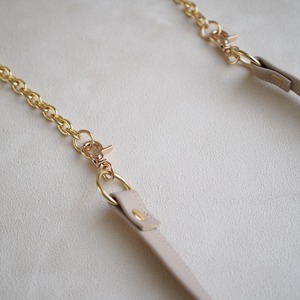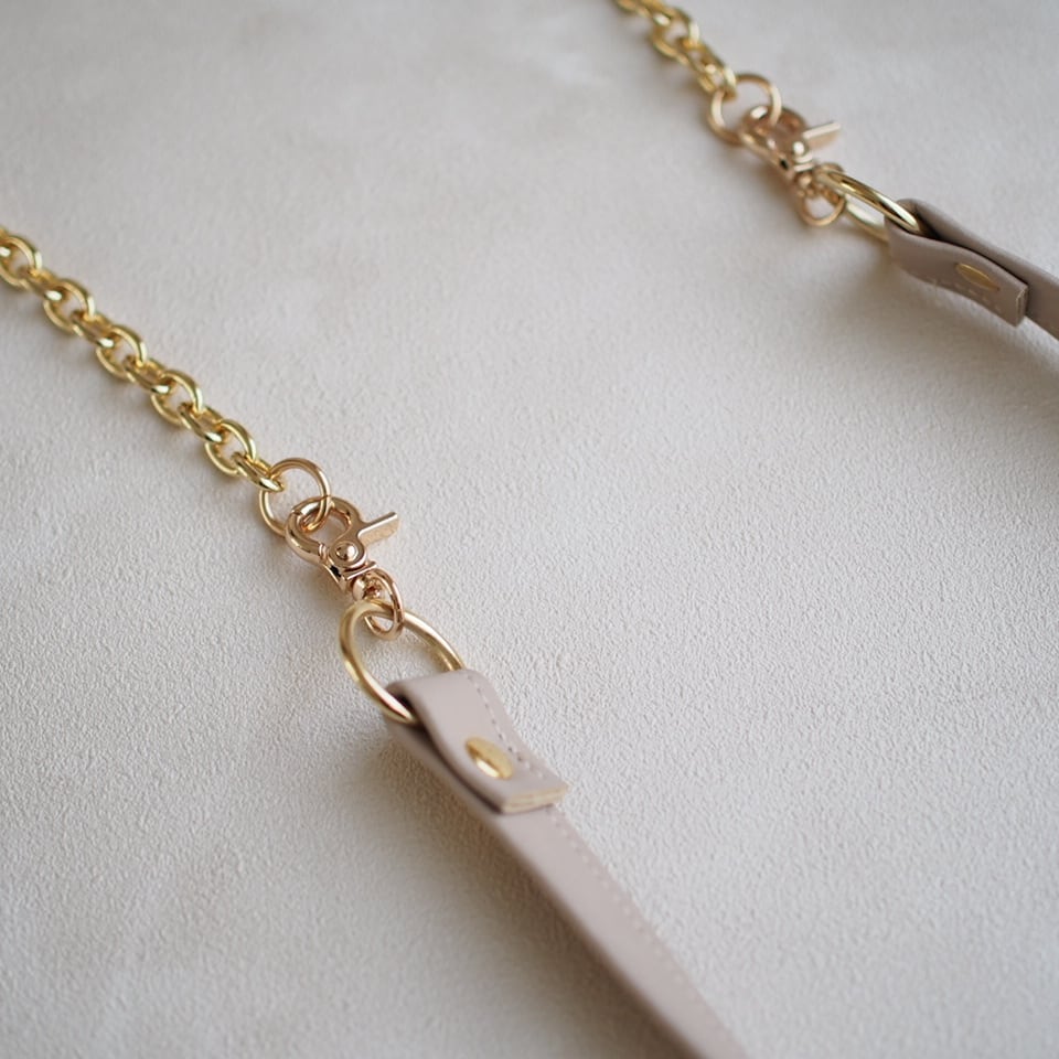 肩がけできるストラップにチェーンを延長すれば、斜めがけにもできる2wayストラップ付き。(ストラップ45cm / アジャスターチェーン33cm×2本)全長110cm