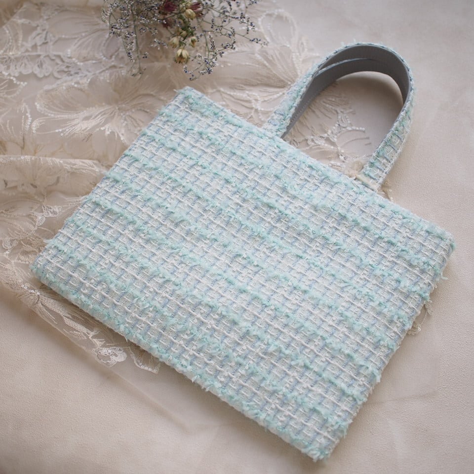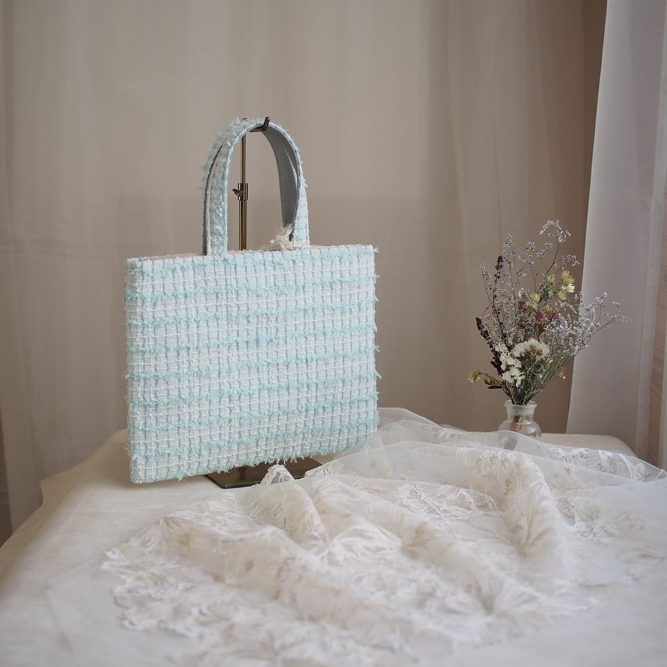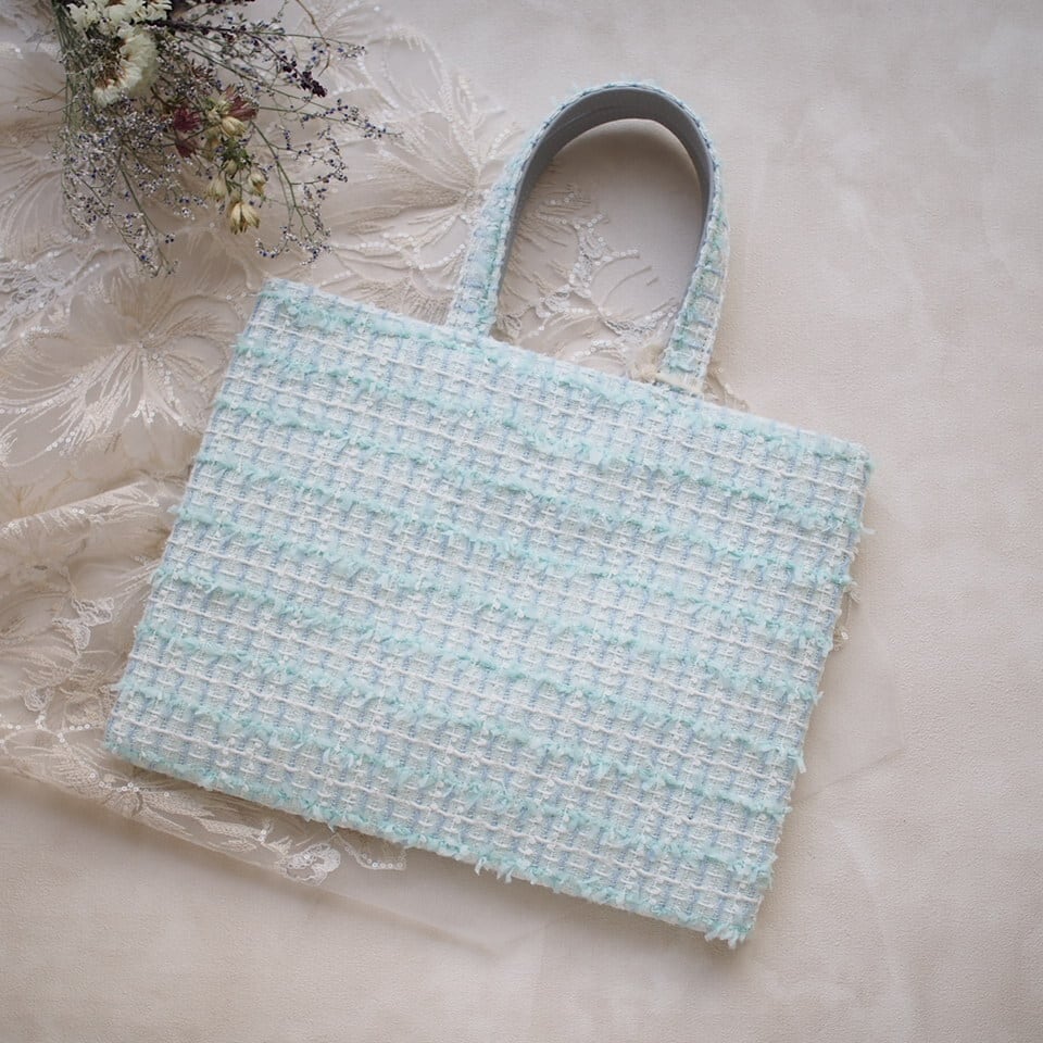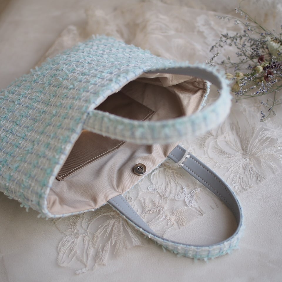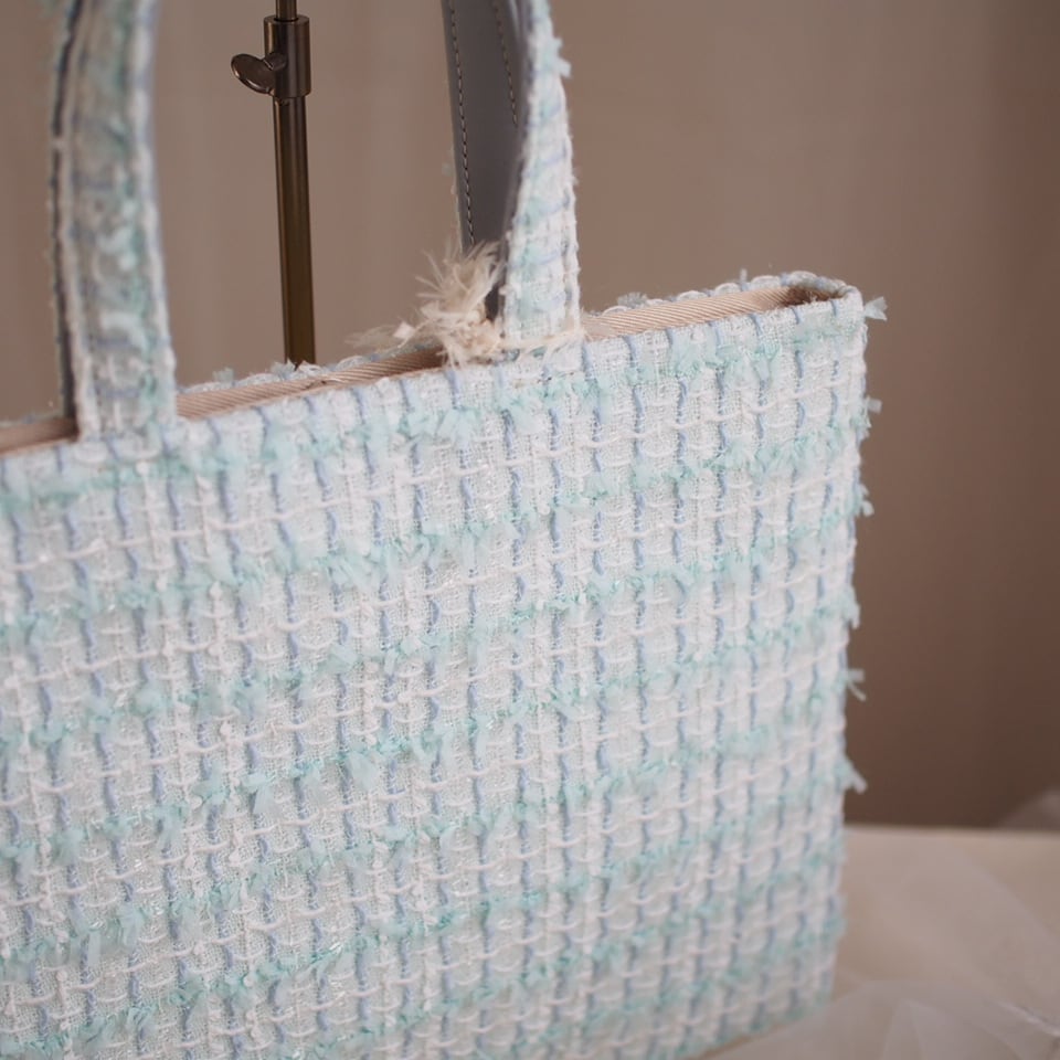 リボンヤーンが可愛くて、ミントブルーの綺麗なツイードです。