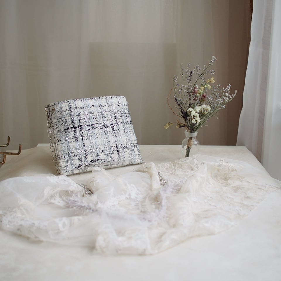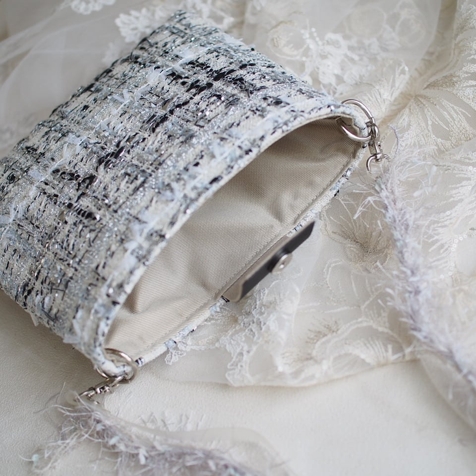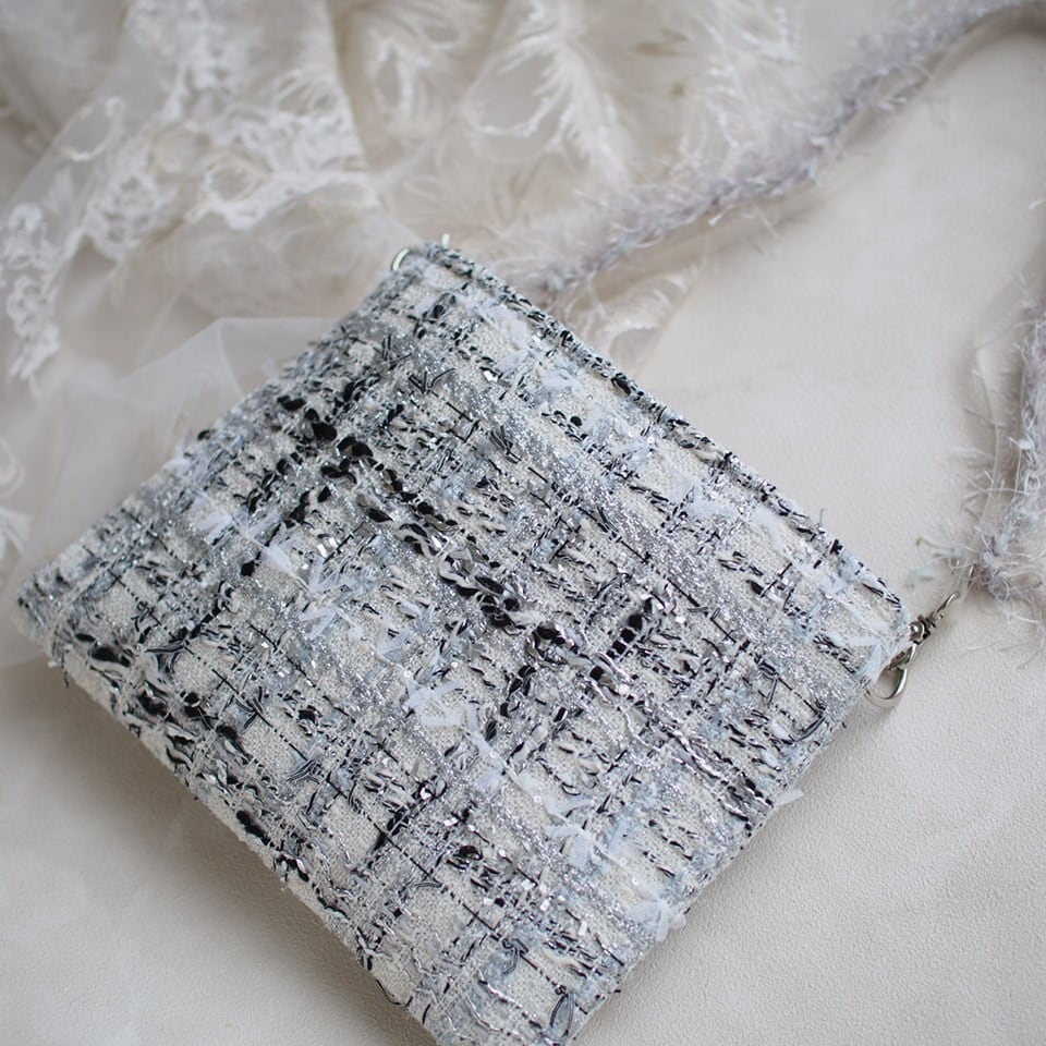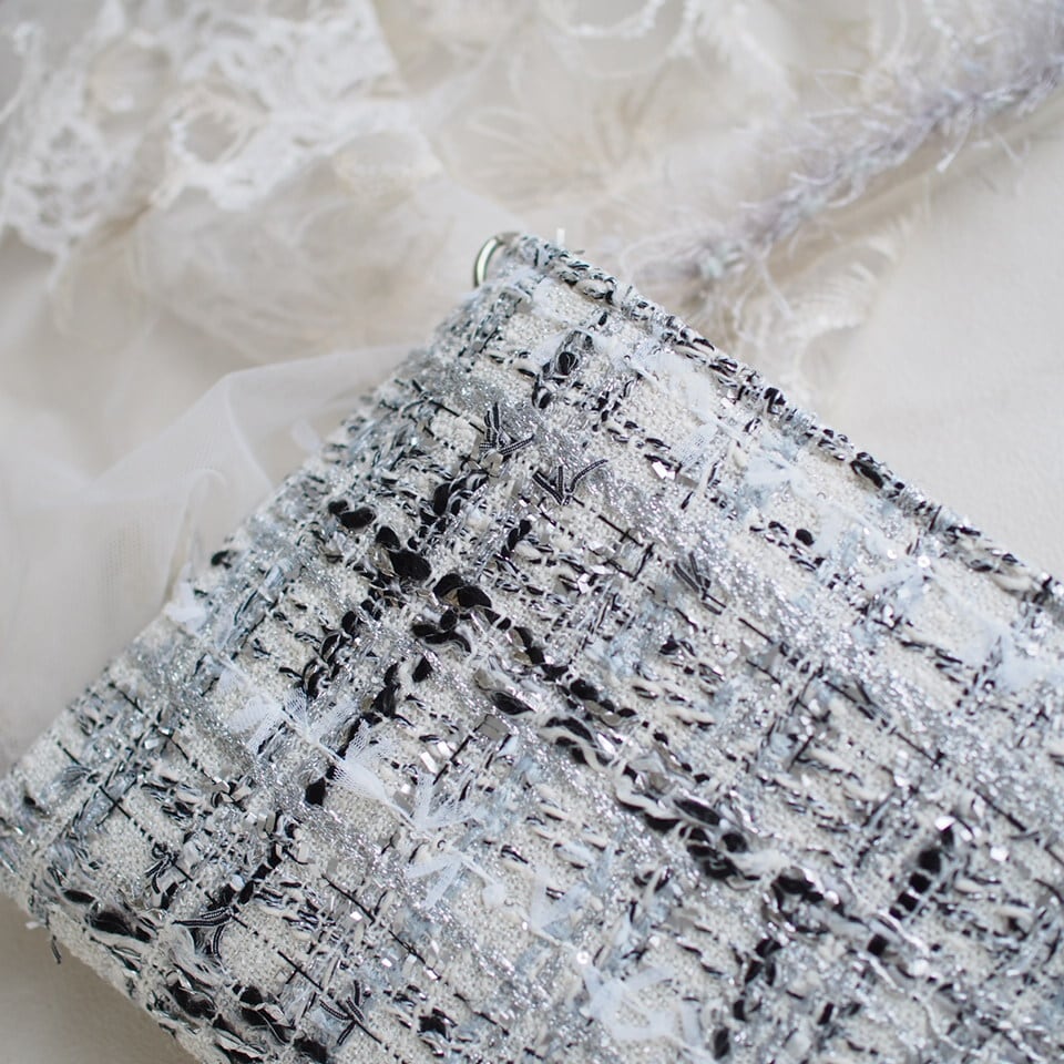 シルバーのラメ感がとってもゴージャスで、でも上品にまとまっているツイードです。ラメ感の美しさにうっとりします。