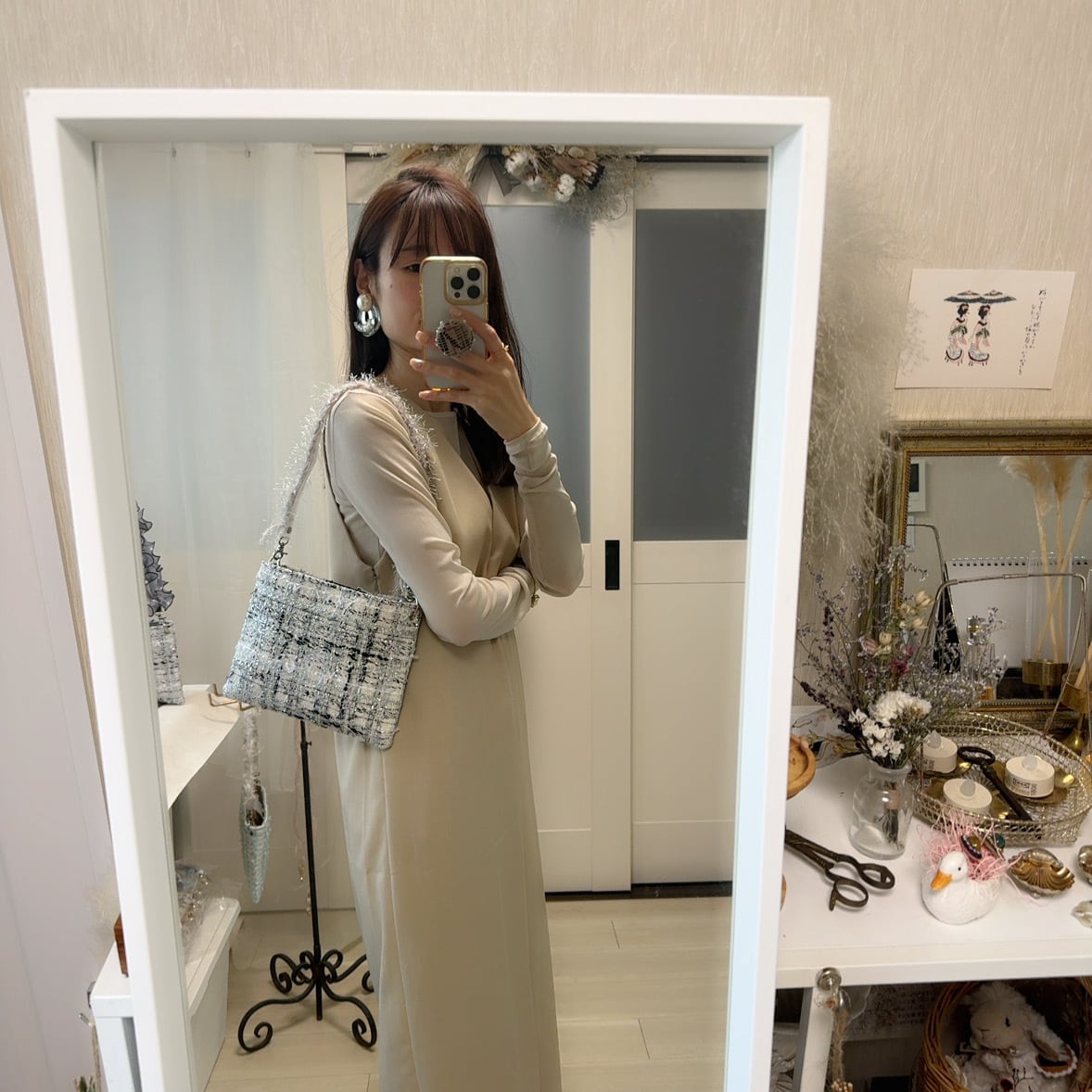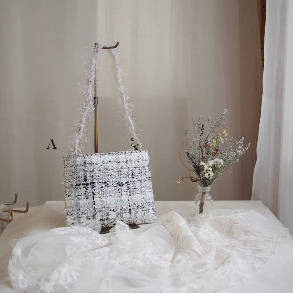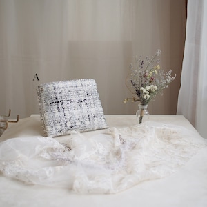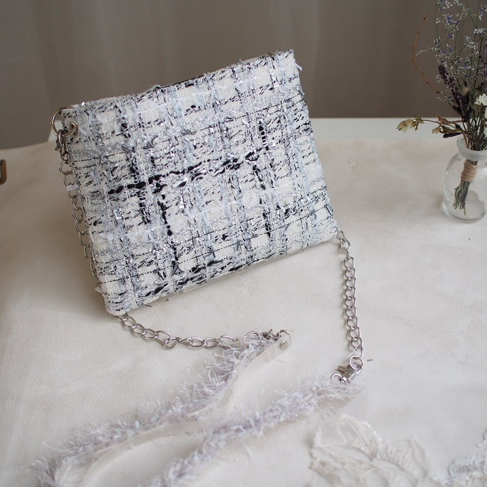 シルバーのラメ感がとってもゴージャスで、でも上品にまとまっているツイードです。ラメ感の美しさにうっとりします。